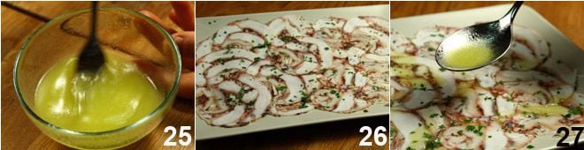 Luego prepara la citroneta que servirá para sazonar el pulpo, emulsionando jugo de limón, aceite de oliva y una pizca de sal 25. Dispón las rodajas de pulpo en un plato, espolvoréalas con perejil picado 26, el ajo y condimenta con la citroneta 27. Adorna el carpaccio de pulpo con rodajas (o gajos) de limón y ramitas de perejil.