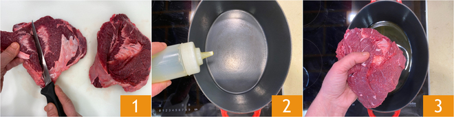 Para preparar la carrillada de ternera estofada, empieza limpiando cuidadosamente la carne, eliminando la membrana en exceso que la cubre 1. Calienta una olla de hierro fundido y vierte un chorrito de aceite en el fondo 2, luego coloca las carrilladas de ternera 3 y dóralas a fuego alto durante 2-3 minutos por cada lado, hasta que se doren.