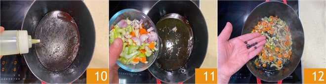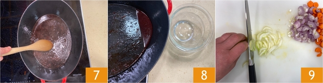 Desglasa el fondo ayudándote con una cuchara de madera 7. Reserva el fondo obtenido, transfiriéndolo a un bol 8. Ahora prepara las verduras: corta groseramente el apio, chalota y zanahorias 9.