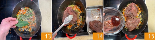 Añade también la hoja de laurel y la ramita de romero 13, dejando que desprendan su aroma. En este punto, coloca nuevamente la carne en la olla 14 y añade el fondo de cocción que habías reservado 15.