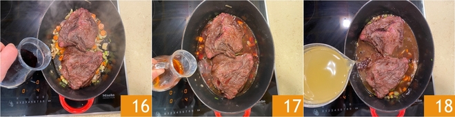 Vierte también los 250 g de Barolo restantes 16, el Marsala 17 y finalmente el caldo de carne caliente 18.