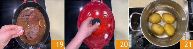 Ajusta de sal 19, cubre con una tapa 20 y deja cocinar a fuego medio-bajo durante al menos tres horas y media, girando la carne cada media hora con unas pinzas 27. Mientras tanto, dedícate al puré: pon a hervir las patatas con la piel 21, tomará unos 30-40 minutos.