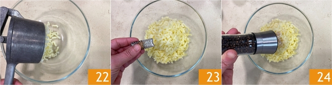 Una vez cocidas, aplástalas aún calientes con un prensador de patatas 22. Sazónalas con una pizca de nuez moscada 23, sal y una pizca de pimienta 24.
