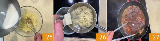Calienta la leche en un cazo y añádela a las patatas 25, transfiere todo a fuego suave mezclando con un batidor para obtener una mezcla suave 25. Añade también la mantequilla 26 y sigue trabajando el puré hasta que se vuelva cremoso. Cuando la carne esté lista 27, retírala de la olla.