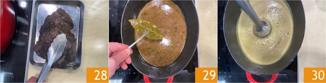 Mantén caliente la carrillada 27. Elimina el romero, el laurel y las bayas de enebro que queden en el fondo de cocción 29, luego tritura todo con una batidora de mano hasta obtener una salsa lisa 30.