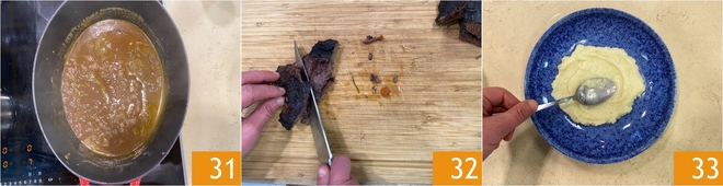 Déjala reducir al fuego durante al menos 30 minutos, hasta que se vuelva espesa y aterciopelada 31. Antes de servir, corta la carne en trozos 32 y coloca el puré en el plato 33.