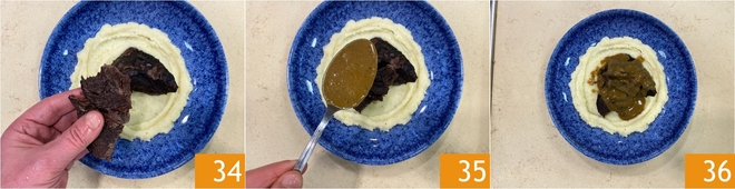 Coloca encima las carrilladas 34 y completa con abundante salsa caliente 35. Sirve inmediatamente la carrillada de ternera estofada 36.