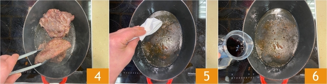 Cuando estén bien doradas, retíralas de la olla 4, elimina la grasa residual y seca con papel absorbente la cacerola 5. En este punto, vierte 100 g de Barolo 6.