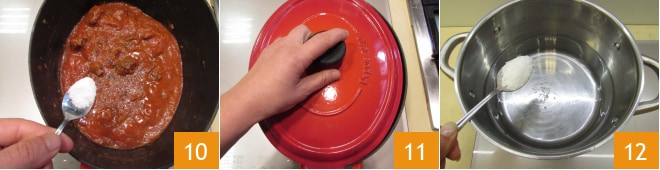 Salpimienta 10, tapa con la tapa 11 y baja el fuego al mínimo. Cocina durante 100 minutos, removiendo de vez en cuando. Mientras tanto, prepara la polenta: coloca al fuego una olla de acero de fondo grueso con agua, cuando el agua esté a punto de hervir, añade la sal 12.