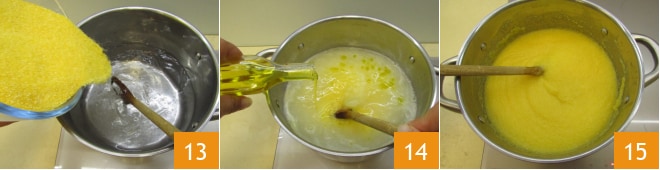Vierte la harina en forma de lluvia mientras remueves con una cuchara de madera 13, mantén la cocción a alta temperatura removiendo rápidamente. Añade también el aceite 14 y continúa removiendo esperando a que vuelva a hervir, luego baja el fuego al mínimo y prosigue la cocción durante 50 minutos a fuego lento removiendo continuamente 15.