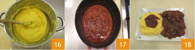 Pasados los 50 minutos, la polenta está lista; sube el fuego para que se despegue bien de la olla 16. Mientras tanto, las carrilleras también estarán cocidas 17, sírvelas junto con la polenta bien calientes 18.