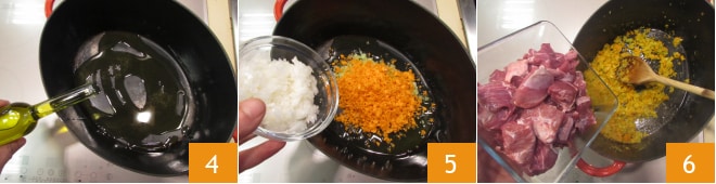 Toma una cazuela de hierro fundido y vierte un chorro de aceite 4. Añade las verduras y el ajo picados 5 y el romero, deja sofreír a fuego moderado hasta que estén pochados. Tomará unos 5 minutos. En este punto, añade las carrilleras 6.