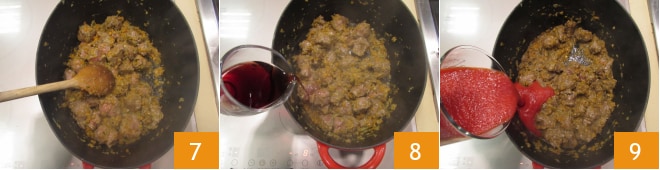 Sube el fuego y dora las carrilleras por todos los lados 7. Añade el vino tinto y deja que el vino se evapore a fuego alto 8. Vierte también el puré de tomate 9.