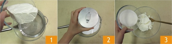 Para preparar las cassatine, lo primero que debes hacer es colocar la ricotta en un colador sobre un bol 1. Pon un plato y un peso encima 2. Deja escurrir la ricotta durante una noche. Luego pésala y transfiérela a un bol. Sécala con un papel de cocina y añade el azúcar 3.
