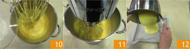 No tengas prisa y solo cuando los huevos estén bien montados, añade la harina 10 y mezcla con el batidor por unos segundos 11. Termina de mezclar con una espátula, luego transfiere la mezcla a un molde de 30x40 cm forrado con papel de horno 12.