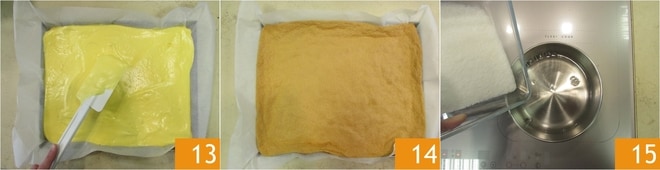 Nivela la superficie con una espátula 13 y hornea en horno ventilado precalentado a 160°C por 30 minutos en el estante medio-bajo. Luego, sácalo del horno 14 y deja que se enfríe. Mientras tanto, prepara el baño. Vierte agua y azúcar en un cazo 15 y lleva a ebullición.