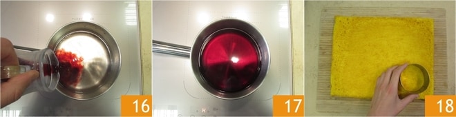 Cuando el azúcar se haya disuelto completamente, añade el alchermes 16 y mezcla. Luego, deja que se enfríe 17. Una vez que el bizcocho esté frío, voltéalo sobre una tabla de cortar y corta discos usando un cortador de galletas grande de 7-8 cm 18.