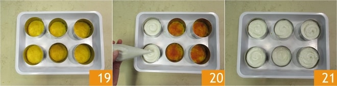 Ahora transfiere los discos de bizcocho dentro de los cortadores de galletas del mismo tamaño que los discos, de unos 5 cm de alto 19. Empápalos con el baño de alchermes 20 y llénalos con la crema de ricotta 21. Cubre con un film de plástico y colócalos en el frigorífico por al menos 10 horas.