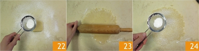 Transcurrido este tiempo, ocúpate de la pasta de almendras. Espolvorea una superficie con abundante azúcar glas, coloca encima la pasta de almendras y agrega más azúcar glas 22. Extiende la pasta usando un rodillo 23, hasta obtener un espesor de 2 mm, añadiendo siempre más azúcar glas para que no se pegue a la superficie 24.
