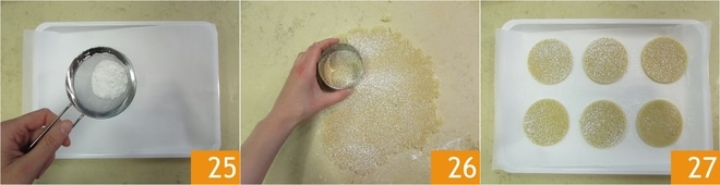 Ahora coloca una hoja de papel de horno en una bandeja, añade más azúcar glas 25 y espolvorea de nuevo la pasta de almendras con el azúcar glas. Córtala 26 para obtener discos y transfiérelos a la bandeja 27. ¿Colócalos en el frigorífico?