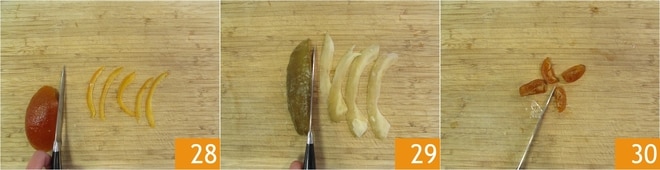 Ahora ocúpate de la fruta confitada. Corta la naranja en rodajas 28 y el cidro 29. Luego corta las mandarinas en cuartos sin romper la pulpa interna 30