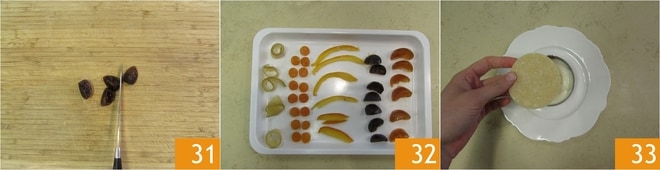 y haz lo mismo con los kumquats 31. Haz también pequeños botones con la naranja. Colócalos todos en una bandejita 32 y reserva hasta el momento de la decoración. Transfiere a un plato una de las cassatine, coloca dentro del cortador un disco de pasta de almendras 33,