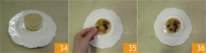 luego retira el cortador 34 y decora con la fruta confitada y los granos de café 35. Haz lo mismo con todas las demás. Las cassatine están ahora listas para servirse 36.