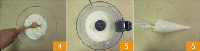 Mezcla bien con una cuchara de madera 4 y cuando hayas obtenido una mezcla homogénea, transfiérela a un procesador. Tritura bien hasta obtener una textura muy lisa 5. Luego, transfiérela a una manga pastelera sin boquilla 6 y colócala en el frigorífico.