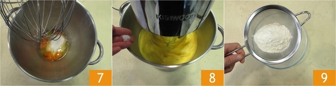 Ahora prepara el bizcocho. En el bol de una batidora planetaria equipada con un batidor, vierte los huevos y el azúcar 7. Comienza a batir con las varillas eléctricas, luego añade la sal 8. Continúa batiendo y mientras tanto tamiza la harina 9.