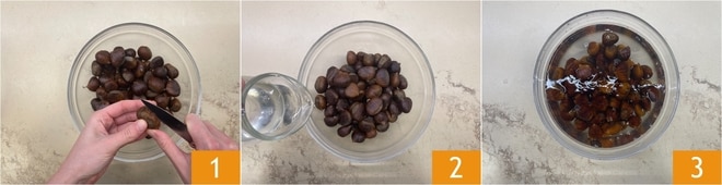 Para preparar las castañas en freidora de aire, lo primero que hay que hacer es realizar un corte horizontal en todas las castañas, usando un cuchillo pequeño 1. Colócalas en un bol y cúbrelas con agua 2. Déjalas en remojo durante 2 horas 3. En esta fase podrás eliminar las castañas dañadas.