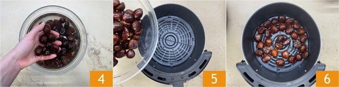 Si deseas cocinar más castañas, asegúrate de que no se superpongan durante la cocción y, si es necesario, aumenta ligeramente el tiempo de cocción. Si son demasiadas, recomendamos usar una freidora más grande o cocinarlas en dos tandas.
