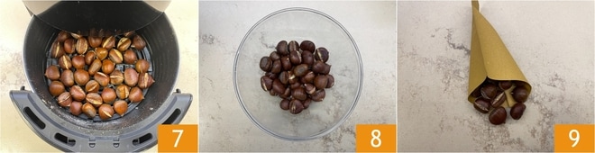 Hornea a 160º durante unos 15 minutos o hasta que el corte de las castañas esté bien abierto 7. Las castañas en freidora de aire están listas 8, solo queda servirlas 9.
