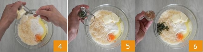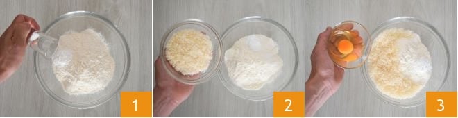 Para preparar las castañuelas saladas al romero, verted la harina en un cuenco grande, añadid la levadura instantánea 1, el parmesano rallado 2 y el huevo 3,