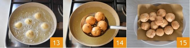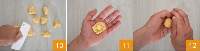 Transcurrido el tiempo de reposo, dividid la masa en pequeñas porciones de unos 12 g cada una 10. Aplanad cada pedazo de masa en la palma de la mano y colocad en el centro un cubo de provolone 11, luego cerrad la masa y formad una bolita 12.