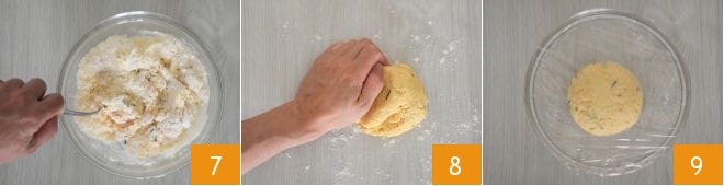 Comenzad a mezclar la masa con un tenedor 7, luego trasladadla a una superficie de trabajo ligeramente enharinada y trabajad con las manos durante unos 5 minutos hasta obtener una mezcla homogénea 8. Poned la masa en el cuenco, cubrid con film transparente 9 y dejad reposar en el frigorífico durante 30 minutos. Mientras tanto, cortad el queso provolone en cubos: necesitaréis unos treinta.