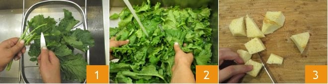Para realizar los cavatelli con salchicha y grelos, lo primero que hay que hacer es ocuparse de los grelos: límpialos separando con un cuchillo las hojas del tallo 1 y enjuágalos bajo agua corriente 2. Corta en trozos grandes la miga de pan fresco 3,