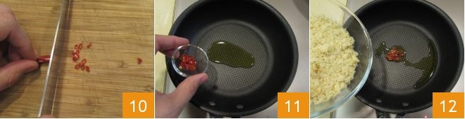 Pon una olla llena de agua al fuego para hervir y salar, servirá para cocer la pasta. Pica también el chile fresco 10 y colócalo en una sartén con 20 g de aceite 11, añade la miga triturada 12