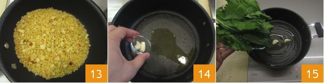 y saltéala en la sartén, removiendo de vez en cuando, hasta dorar 13. Reserva la miga para la guarnición del plato. Mientras tanto, en la misma cacerola de la salchicha, dora 2 dientes de ajo pelados y enteros con 20 g de aceite 14, luego añade los grelos 15; presiona bien para hacerlos caber todos en la cacerola, ya que pronto se reducirán en volumen.