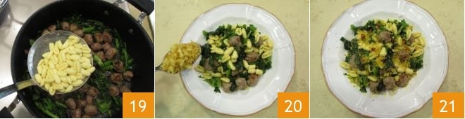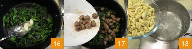 Cuece los grelos durante unos 10 minutos, al final de la cocción elimina los dientes de ajo 16 y añade las bolitas de salchicha reservadas 17, ajusta de sal. Mientras tanto, cuece los cavatelli frescos durante 5 minutos 18;