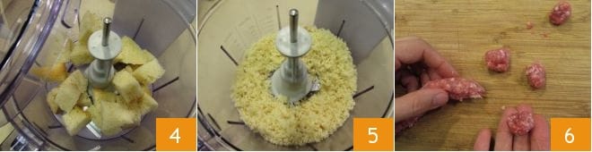 colócala en un procesador de alimentos 4 y tritúrala finamente 5. Quita la tripa y desmenuza la salchicha, forma pequeñas bolitas con las manos 6,