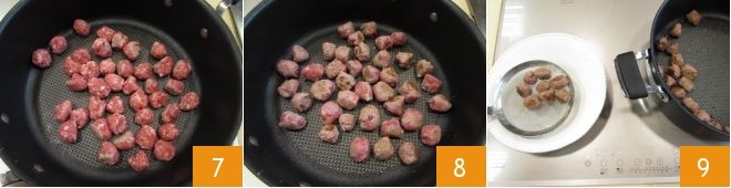 y dóralas a fuego medio-alto en una sartén ya bien caliente durante unos 10 minutos (7-8). Luego transfiérelas a un plato 9, cubre con papel film para mantenerlas calientes y continúa con la preparación, manteniendo esta sartén en la que has cocido la salchicha a un lado con el fondo de cocción que se ha creado.