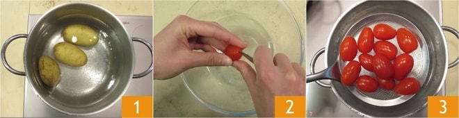 Para preparar los cavatelli de patatas con tomatitos y ricotta, primero cuece las patatas para la preparación de los cavatelli 1; tardarán de 30 a 40 minutos, dependiendo del tamaño, hasta que puedas pincharlas fácilmente con un tenedor. Mientras tanto, prepara el condimento: lava y seca los tomatitos, luego con la punta de un cuchillo haz un corte en la piel en uno de los extremos 2. Lleva a ebullición una olla con agua y blanquea los tomatitos durante unos 30 segundos 3.