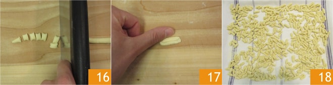 Corta los cordones en trozos de un máximo de 2 cm de longitud 16. Con el pulgar, presiona cada trozo de pasta en el lado del corte y arrástralo sobre la mesa de trabajo desde abajo hacia arriba para crear la típica forma cóncava 17. A medida que estén listos, coloca los cavatelli sobre un paño ligeramente enharinado 18.
