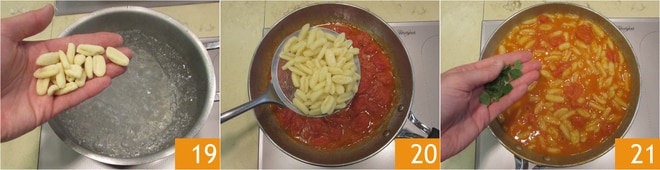 Mientras tanto, pon al fuego una olla con agua, añade sal cuando hierva y cocina los cavatelli 19. Cuando floten, escurre los cavatelli en la sartén con el condimento 20 y aromatiza con el orégano fresco 21.