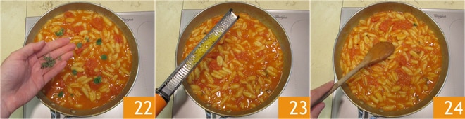 Añade también el tomillo fresco 22 y la cáscara de limón rallada 23, luego mezcla bien y manteca todo en el fuego por unos instantes 24.