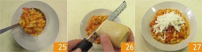 Estás listo para emplatar: distribuye los cavatelli así condimentados en los platos 25, luego completa con una abundante ralladura de ricotta ahumada 26. ¡Tus cavatelli de patatas con tomatitos y ricotta están listos para ser servidos 27!