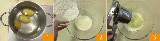 Para preparar los cavatelli, primero cuece las patatas empezando con agua fría hasta que estén lo suficientemente blandas como para poder pincharlas fácilmente con un tenedor 1; tomará entre 30 y 40 minutos, dependiendo del tamaño. Mezcla la harina con la sémola 2, luego machaca las patatas dentro del bol 3; la piel quedará dentro del machacador de patatas.