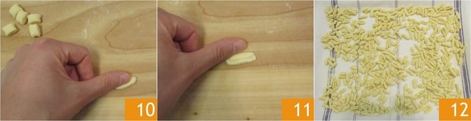 Con el pulgar presiona cada trocito desde el lado del corte y arrástralo sobre la mesa de trabajo de abajo hacia arriba 10 para crear la clásica forma cóncava 11. Colócalos poco a poco sobre un paño ligeramente enharinado, ¡y los cavatelli de patata estarán listos para ser cocidos y aderezados a tu gusto 12!