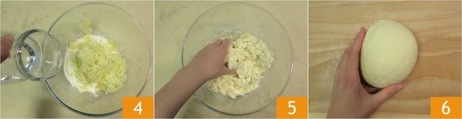 Añade también el agua a temperatura ambiente 4 y mezcla la masa con las manos 5, luego transfiérela sobre la mesa de trabajo y sigue trabajando hasta obtener una masa lisa y homogénea 6.
