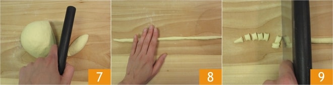 Con un rasqueta divide la masa obtenida en porciones más pequeñas 7, enharina ligeramente la superficie de trabajo y estíralas con la punta de los dedos para obtener cordones de aproximadamente 1 cm de grosor 8. Corta los cordones en trocitos de una longitud máxima de 2 cm 9.